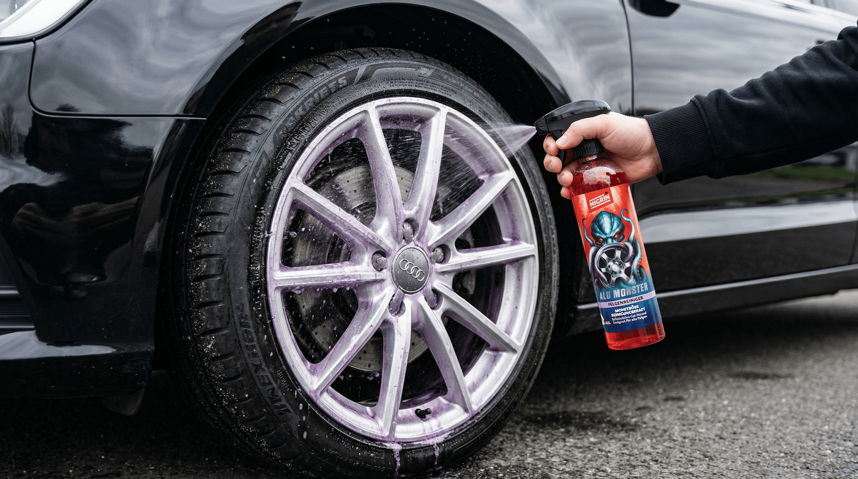 Alu Monster Felgenreiniger 5000 ml aus kurzer Distanz gleichmäßig auf die abgekühlte Felge sprühen
