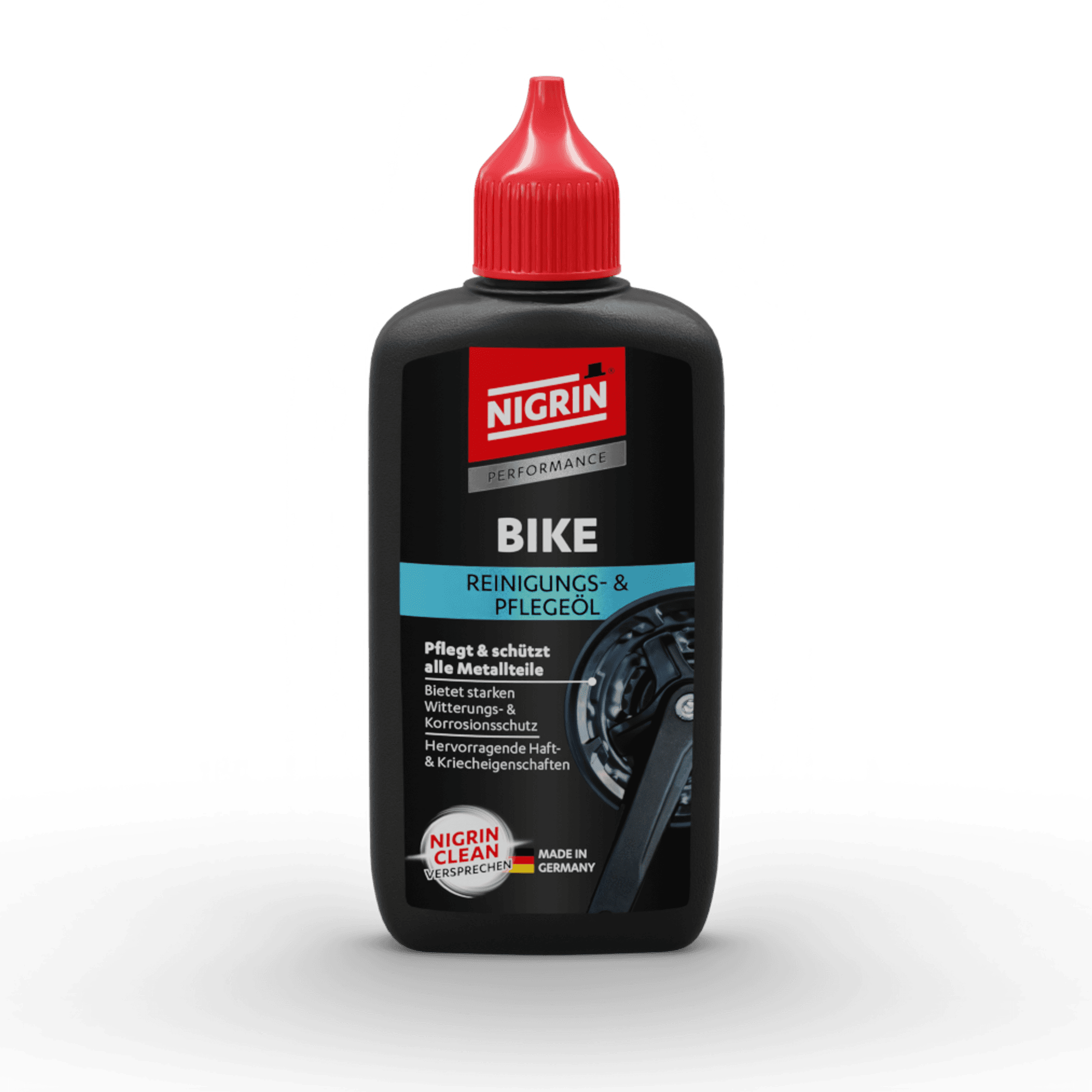 NIGRIN PERFORMANCE BIKE Allwetter Kettenöl ist ein Hochleistungs-Schmierstoff, der die Reibung lang anhaltend verringert.