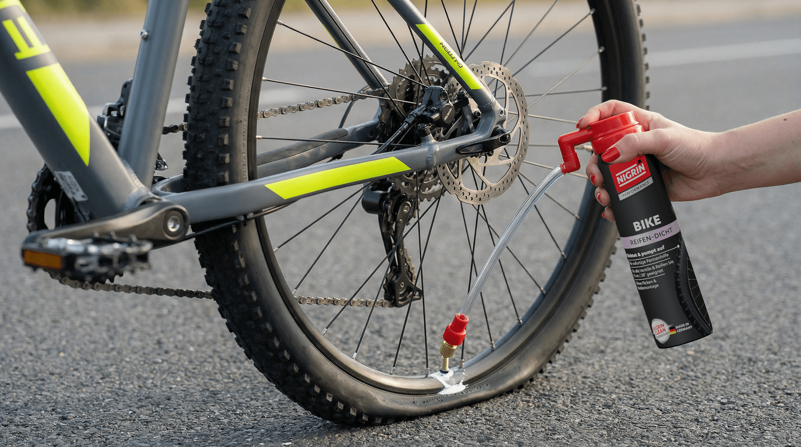 NIGRIN Bike-Care Reifen-Dicht ist die schnelle und unkomplizierte Lösung bei einem platten Fahrradreifen. Das handliche Pannenspray dichtet Löcher im Schlauch oder Schlauchreifen automatisch und luftdicht ab – ohne Reifenwechsel oder Werkzeug.